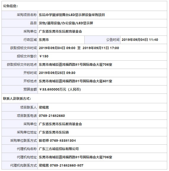 東坑中學(xué)籃球館舞臺LED顯示屏設(shè)備采購項目