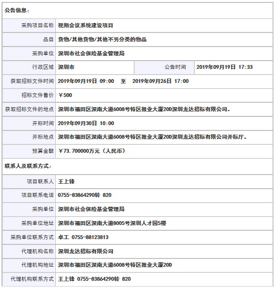 深圳市社會保險基金管理局視頻會議系統建設項目公開招標公告