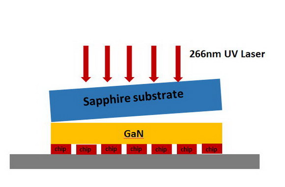 激光剝離技術(shù)通過利用高能脈沖激光束穿透藍(lán)寶石基板,光子能量介于藍(lán)寶石帶隙和GaN帶隙之間,對藍(lán)寶石襯底與外延生長的GaN材料的交界面進(jìn)行均勻掃描;GaN層大量吸收光子能量,并分解形成液態(tài)Ga和氮?dú)猓瑒t可以實(shí)現(xiàn)Al2O3襯底和GaN薄膜或GaN-LED芯片的分離,使得幾乎可以在不使用外力的情況下,實(shí)現(xiàn)藍(lán)寶石襯底的剝離。