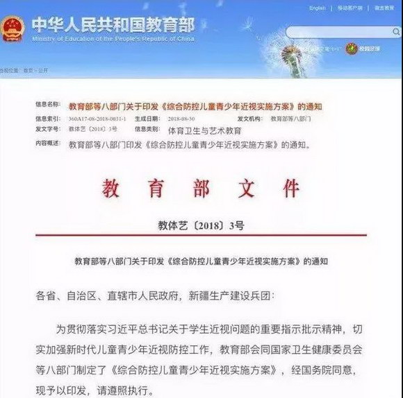2018年8月30日,經國務院同意,教育部、國家衛生健康委員會、國家體育總局等相關政府部門聯合印發《綜合防控兒童青少年近視實施方案》。到2023年,6歲兒童近視率控制在3%左右;小學生近視率下降到38%以下;初中生近視率下降到60%以下;高中階段學生近視率下降到70%以下。