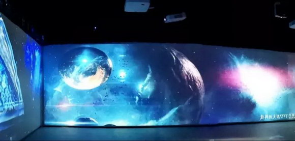 展示中心的360°沉浸式展廳的畫面分別由4個立面與地面組成,構建出逼真而清晰的立體環(huán)境,每個立面寬22米,地面面積達484平方米。為了打造高質量的感官視界,最終選用40臺NEC PA653UL+液晶激光工程投影機,以水平吊裝正投(墻面投影)+垂直安裝(地面投影)方式投射,環(huán)顧四周產生超視野畫面,讓觀眾在高質量的聲音與高清畫面環(huán)境包圍之中,產生身臨其境的強烈現(xiàn)場感和沉浸感。