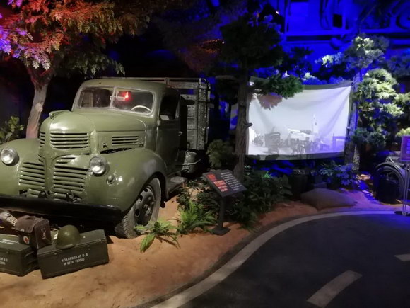 電影老爺車博物館中,搭配“公路”型走道,以電影中使用過的服裝、道具與軍用裝備為每一輛車搭建拍攝場景。電影場景的投影播放,喚醒人們的時代記憶。