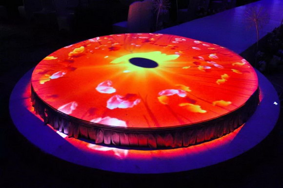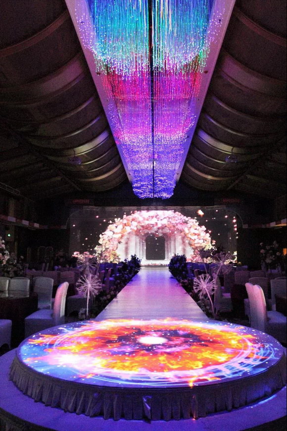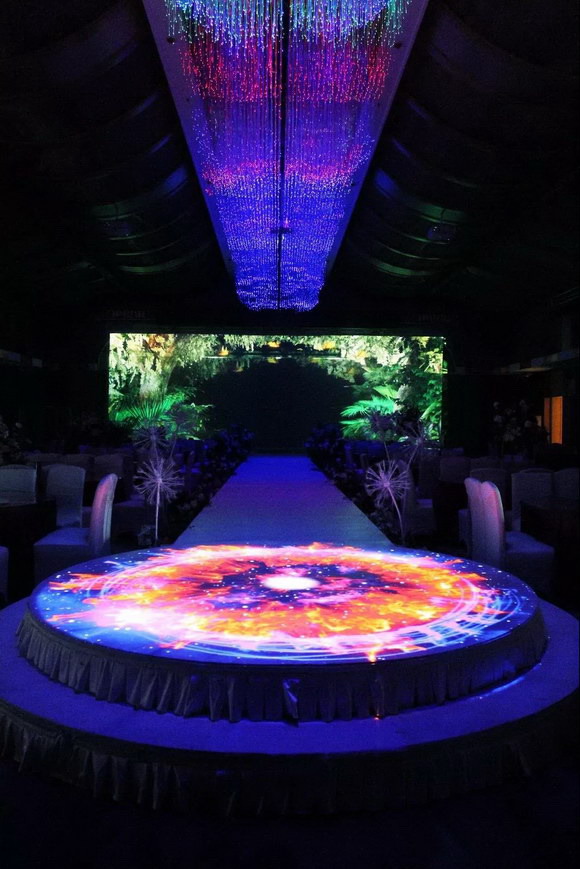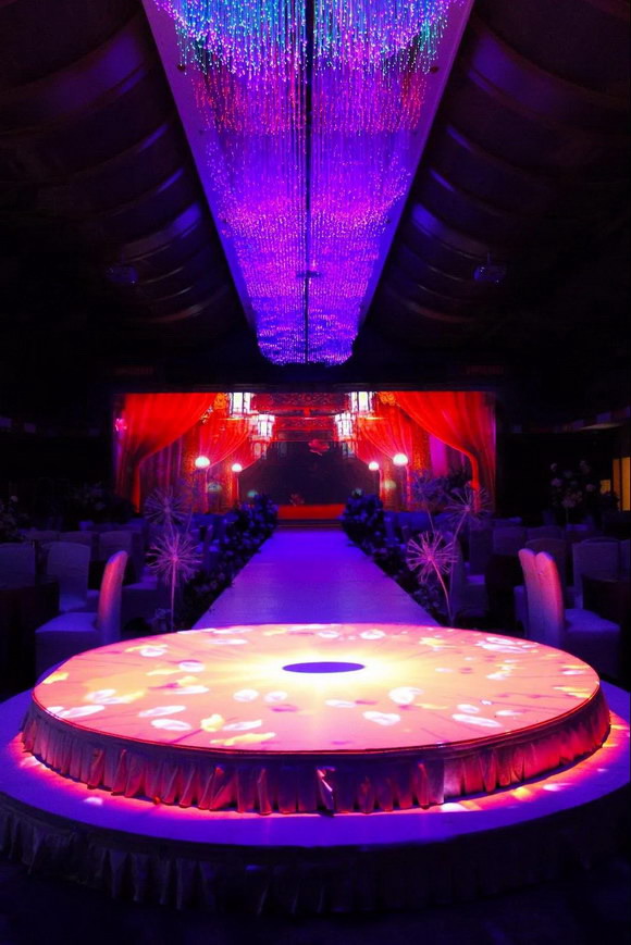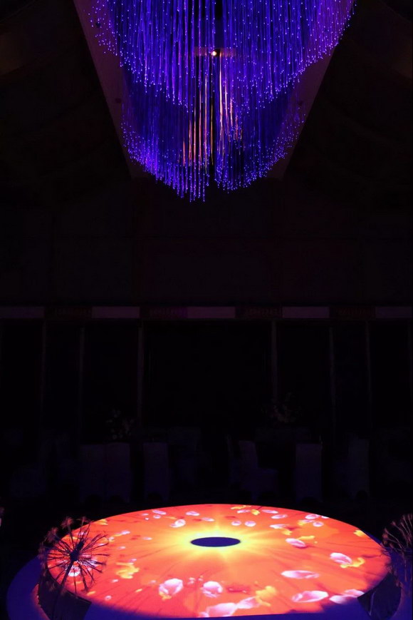舞臺對面是一個(gè)直徑3米的公主臺,該公主臺采用一臺NEC PA903X+(NP13ZL鏡頭)以垂直豎向投射方式打造。點(diǎn)亮投影機(jī),公主臺即刻變成一個(gè)多彩的大圓盤,當(dāng)新娘穿著潔白的婚紗置身公主臺,潔白的婚紗如施了魔法般即刻呈現(xiàn)出鮮花、火焰、星光等圖案,瞬間成為全場的焦點(diǎn)。