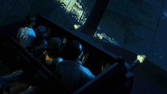項目采用了大型機模特技表演、機械特技、6自由動感小車、及特效燈光、 熒幕(環幕、直幕、組合幕)等各種技術手段,虛實結合,打造了一個驚心動魄的沉浸式太空穿梭黑暗騎乘項目。