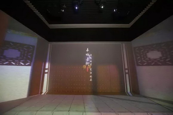 從扶梯上2樓穿過門廊,進入歷史陳列廳,稍走幾步,展現在游客們面前的是一個龐大的體驗空間,一座座宏偉的古城建筑在投影光線中“拔地而起”,亦幻亦真,讓游客們仿佛置身于奉賢古城的繁華市井之中。