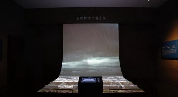 繼續向前進入另一區域,兩臺巴可G60系列投影機配合L形的投影曲幕,將奉賢石塘護塘工程系統運行機制近距離展現在游客面前,憑借G60系列高亮度輸出以及色彩精確還原的專業性能,將先人們制造奉賢護塘系統運作機制的智慧向游客們娓娓道來。