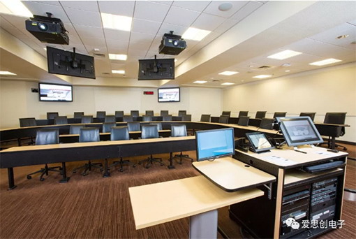 Lucas 126、福布斯家庭會議中心和 Lucas 107 等房間是首批安裝試點。其設計主要通過 Extron DTP CrossPoint 4K Series 圖像解析度轉換演示矩陣切換器來提供完整的視音頻信號切換及路由。講桌裝有置信監控器,根據教室的不同大小,配備 2 個或以上的投影系統,以及 LCD 平板顯示器。電腦、實物展臺或媒體播放器等信號源設備,以及視音頻設備分別被安裝在房間后方的 IDF 機柜或講桌內。講桌表面嵌入的 Extron Cable Cubby® 接線盒,可提供便利的視音頻連接,以及為老師的筆記本電腦或其它設備提供電源連接。