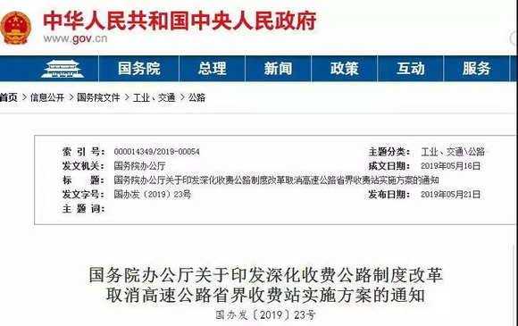2019年5月21日,國(guó)務(wù)院辦公廳印發(fā)深化收費(fèi)公路制度改革,取消高速公路省界收費(fèi)站實(shí)施方案的通知(國(guó)辦發(fā)〔2019〕23號(hào)),力爭(zhēng)2019年底前基本取消全國(guó)高速公路省界收費(fèi)站。
