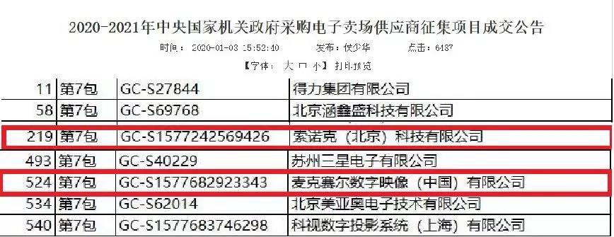 2020-2021年中央國家機關政府采購電子賣場供應商征集項目即中央政府采購供應商入圍已經開始,東方中原旗下自主品牌Sonnoc索諾克和代理品牌Maxell麥克賽爾投影機均已成功入圍。