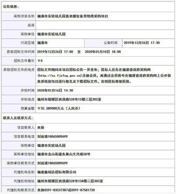 采購項目名稱: 福清市實驗幼兒園直錄播設備貨物類采購項目
