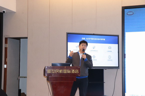 深圳光峰科技股份有限公司家用事業部東北華北大區總監李響介紹了光峰ALPD®激光顯示技術產業優勢,目前光峰ALPD ®激光光源已經進化到 第4代 ALPD®技術、已經做到家庭至影院標準,得到好萊塢制定的 DCI 標準認可、亮度達到 60,000 流明,唯一經過主流影院驗證的激光顯示技術、光峰全方位的專利保護,在全球有極強的專利優勢、光峰從商業模式、制造、技術等都有 極強 的生態圈。