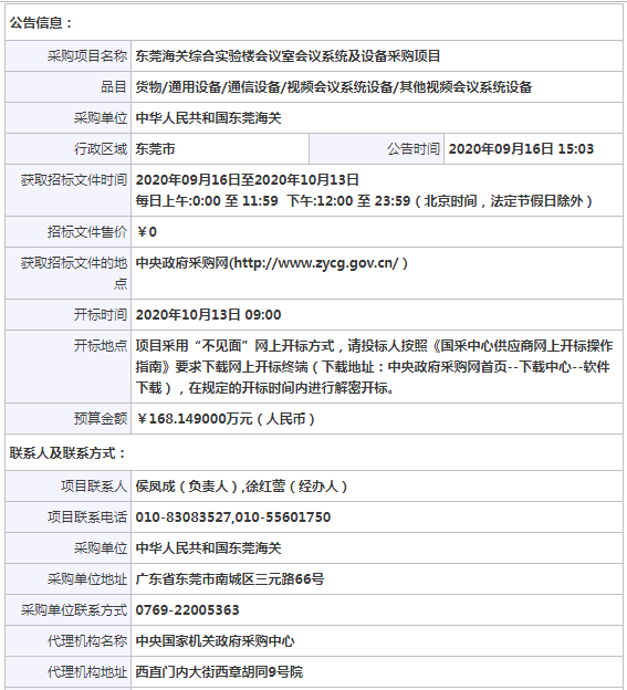 采購項目名稱: 東莞海關綜合實驗樓會議室會議系統及設備采購項目