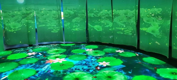 互動(dòng)展區(qū),麥克賽爾DLP激光工程投影機(jī)再次展現(xiàn)了投影魅力,呈現(xiàn)了一場(chǎng)沉浸式互動(dòng)體驗(yàn)光影展。環(huán)形排列的感應(yīng)玻璃,顯示出波瀾不驚的水面,觀眾用手將其連接,江湖瞬時(shí)連通,水中魚兒暢游、水母綻放。