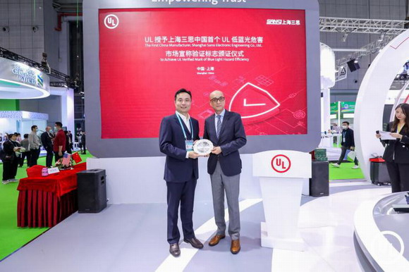 全球著名的安全性標(biāo)準(zhǔn)起草、制訂的第三方機(jī)構(gòu)——UL公司也亮相這一全球盛會(huì),并在此期間(11月6日下午)向上海三思電子工程有限公司(以下簡(jiǎn)稱上海三思)頒發(fā)了中國(guó)首個(gè)UL低藍(lán)光危害驗(yàn)證標(biāo)志證書。