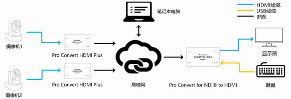 Pro Convert解碼器的用戶可以使用設備上的USB-A接口連接鍵鼠,在不登錄Web GUI的情況下直接設置解碼器參數。升級解碼器的固件至版本V1.1.595后,用戶還可以為鍵盤設置熱鍵,快速地切換信號源,實現更靈活的解碼顯示應用。下面將通過NDI編解碼視頻傳輸方案來介紹該功能。