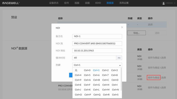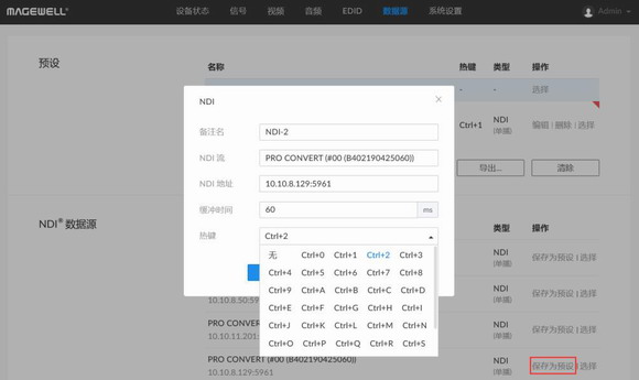 3、登錄解碼器的Web GUI,選擇網絡中可用的一路NDI流,點擊“保存為預設”。在彈出的“NDI”配置界面,編輯“備注名”、“NDI流”和“緩沖時間”。點擊“熱鍵”欄,在彈出的窗口選擇所需對應的熱鍵,如“Ctrl+1”,點擊“確定”。
