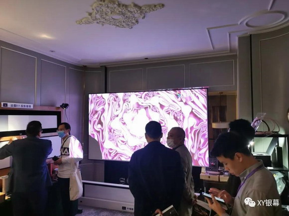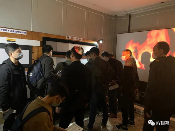 展會第二天,XY銀幕的展位上觀眾有增無減。熱門產品豪華隱藏天花幕以及地升幕等更是“門庭若市”,無論從功能還是美觀上來說,都極度吸引眾多觀眾。