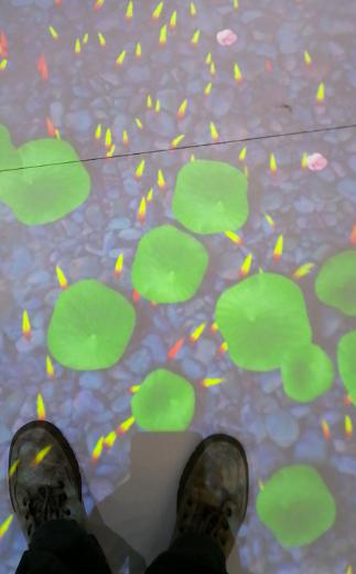 采用1臺NEC激光液晶投影機P605UL+(6200流明高亮度、WUXGA分辨率)搭載雷達眼觸控系統(tǒng)實現(xiàn)的地面互動展項同樣精彩。通過行走,即可展開人與花海、錦鯉、荷塘青蛙的趣味互動。觀眾稍稍走進,花海綻放、錦鯉嬉戲、青蛙玩耍,大自然的魅力讓觀眾沉醉其中。不僅如此,觀眾還可以通過雙腳比劃,進行切水果的小游戲,體驗簡單的游戲樂趣。