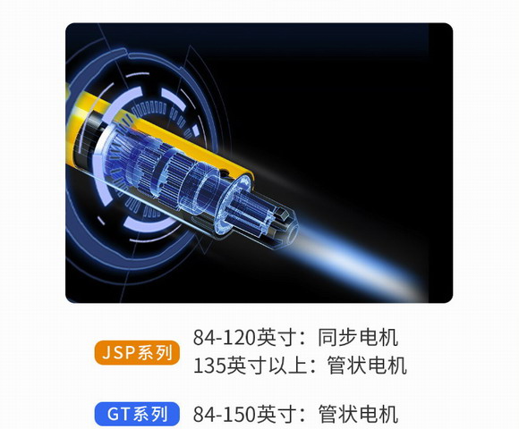 第二,電機對比。JSP系列采用德國工藝靜音電機,更靜音更有力,節能環保。(小Tips:84-120英寸使用同步電機,135英寸以上使用管狀電機);GT系列則采用管狀電機,使用壽命長,運作速度快。具備限位記憶功能,過熱自動保護裝置,給您安全無憂選擇!
