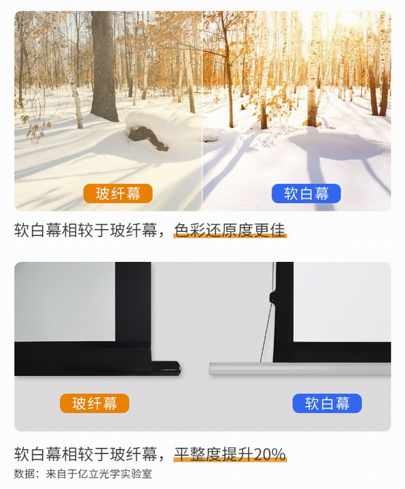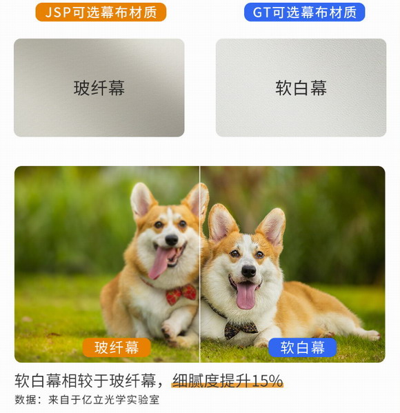 第三,幕布材質對比。JSP系列可選幕布材質為玻纖幕,GT系列可選幕布材質為軟白幕。兩者對比,軟白幕相較于玻纖幕,細膩度提升15%,同時色彩還原度更佳,平整度提升20%(數據來自于億立光學實驗室)。