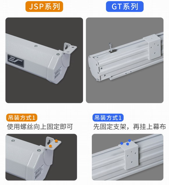 第四,安裝方式對比。JSP和GT系列,都適用于吊裝方式安裝和壁掛方式安裝,但是在安裝方法上還是有所區別的。舉個例子,JSP系列相對來說安裝比較簡單快捷,同樣是在吊裝方式的情況下,JSP采用螺絲向上固定和掛鉤安裝的方法即可;GT要在先固定支架的情況下,再進行后續操作。同時,在壁掛方式上,兩者也是有所區別。詳情請看圖片!