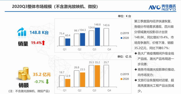 在上半年新冠疫情影響下,國內激光投影市場數年來首次“半年報收平”,這讓行業對激光投影是否還能高速增長,捏了一把汗。2020年第三季度,激光投影市場重拾增勢——奧維咨詢數據顯示,三季度國內傳統投影市場激光產品銷量達14.88萬臺,增幅19.4%;銷售額35.3億元,同比略下降0.7%。