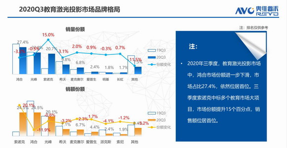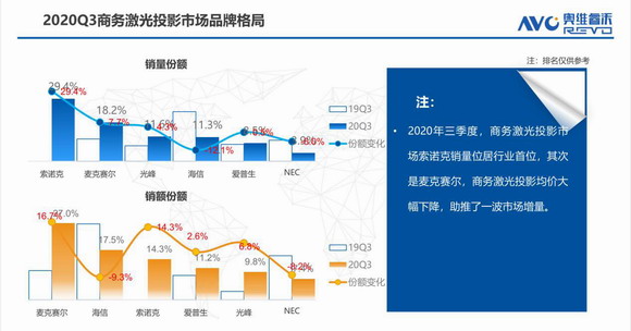 “依托商教市場的增量,索諾克實現了新的躍遷!”第三季度,激光投影市場,索諾克整體銷量排名第二,僅次于海信,占有率12.1%,增幅308.1%;銷額占10.5%,增幅250.9%。海信的家用、索諾克的商教,已經成為2020年激光投影市場增長的“標桿”!