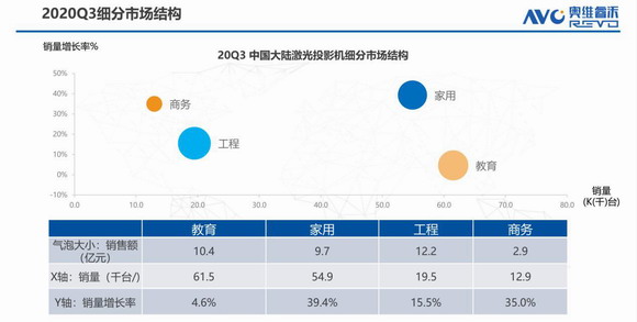 “頭兩年的龍頭,工程現在弱勢!對于激光投影企業而言,2020年的成長必須建立在新動能之上。”這一點也在第三季度的數據中得到了很好的體現:即傳統商教市場、特別是商務市場的啟動成為行業增量的新支點。