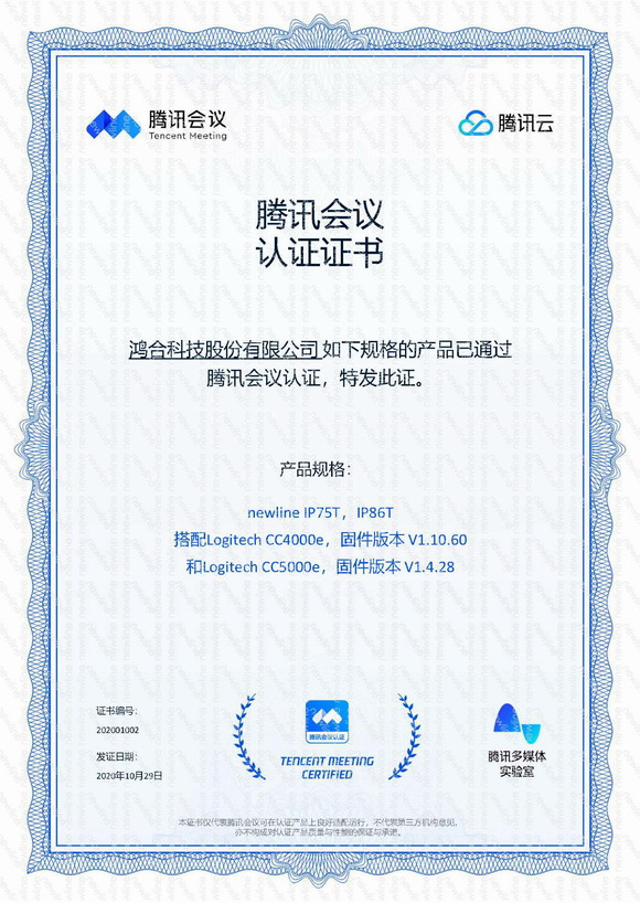 除了newline TC65之外,newline IP75T、IP86T兩款產品也順利通過騰訊會議認證,并獲得認證證書,這充分展現了newline在核心技術、產品研發方面的深厚積累與強大實力。75英寸和86英寸兩種尺寸可以匹配更豐富會議空間,為企業用戶提供更多高穩定性、高可靠性、高安全性的多元化視頻會議解決方案