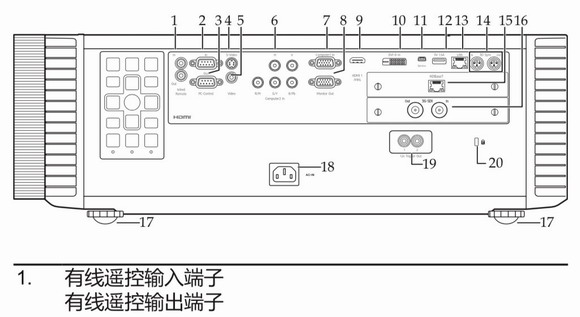 Beverly系列投影機(jī)即提供有線遙控輸入接口(圖示中標(biāo)1處),還提供有線遙控輸出接口,實現(xiàn)投影機(jī)之間的串接。
