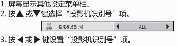 (4)GrandCanyon雙燈系列:按住遙控器上的ID鍵后,再按下數(shù)字鍵(0-9)設(shè)置一個兩位數(shù),比如01或者10,投影機(jī)OSD菜單對應(yīng)ID設(shè)置在“其他設(shè)定”-“投影機(jī)識別號”菜單進(jìn)行操作,可以選擇All或者數(shù)字01-63之間的二位數(shù)數(shù)值。如果遙控器ID需要復(fù)位,按住遙控器上的ID鍵鍵同時按住全部ALL鍵。