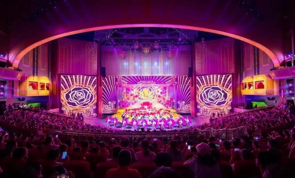 在夢外灘景區,《百老舞匯》作為詮釋老上海文化的經典節目,以及橫店演藝秀3.0的代表作,人氣爆棚。整場節目分為石庫門、碼頭、百樂門3個表演廳,觀眾從走著看、站著看,到最后的坐著看,以全過程的沉浸體驗,不僅能近距離感受老上海的市井文化、黑幫文化和百樂門文化等多元文化,更能穿越歷史重溫老上海歌舞娛樂業的繁華與時代特色。