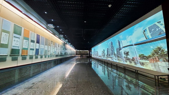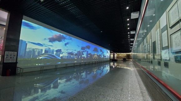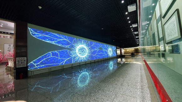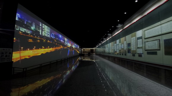 巨幕對(duì)面陳列著靜態(tài)櫥窗,將動(dòng)態(tài)詩詞與靜態(tài)書畫構(gòu)成一個(gè)整體。為了能夠觀看清楚每部作品的細(xì)節(jié),展廳天花板設(shè)有數(shù)量較多的筒燈?紤]到館內(nèi)強(qiáng)光將影響投影效果的這一因素,哈勃PA1004UL-W+ 液晶激光投影機(jī)1萬流明的高亮度,對(duì)明亮度和超寬屏畫面效果來說是一個(gè)更好的選擇。