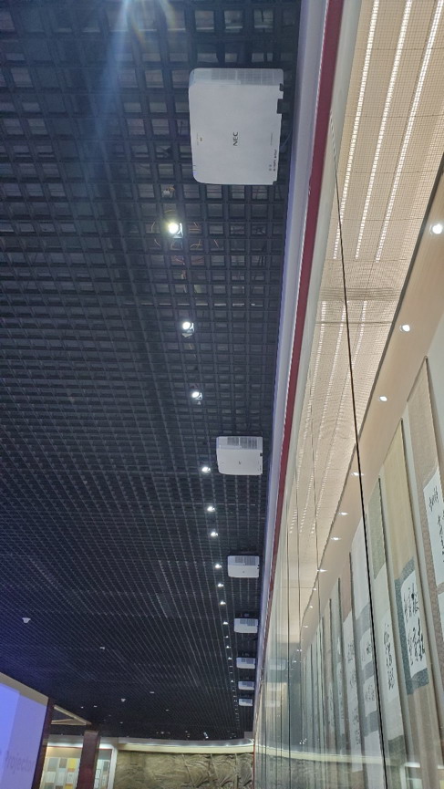7臺(tái)投影機(jī)沿博物館天花板鋁格柵一側(cè)依次吊裝開來,白色簡潔機(jī)身與博物館空間裝飾相稱。并且,PA1004UL-W+ 機(jī)身緊湊小巧,重量約24KG,適合搬運(yùn)和吊裝。該項(xiàng)目中,7臺(tái)哈勃系列投影機(jī)均搭配短焦鏡頭,在不足6米的投射距離條件下,每臺(tái)投影機(jī)也能實(shí)現(xiàn)寬度約為5米的大尺寸投影畫面,滿足了近距離投射大畫面的需求。