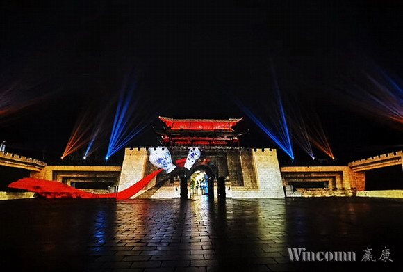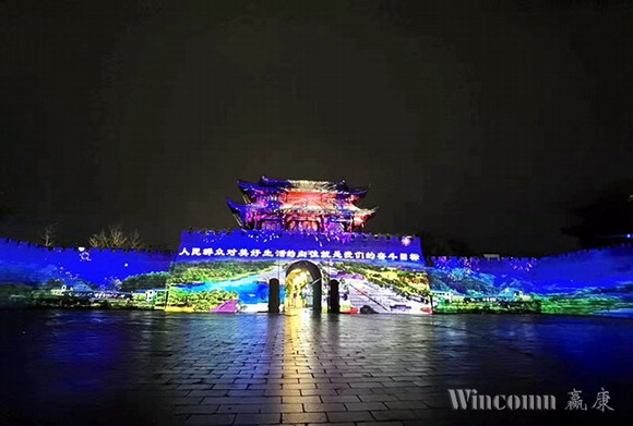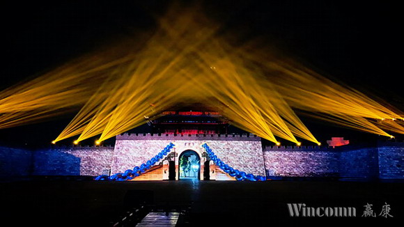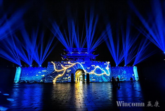 該演出中的古城樓,城墻部分長113米,城樓的最高處為17米,城墻和城樓之間的前后縱深達35米,是一座氣勢恢宏的經典古代城樓建筑, 建于唐朝元和十一年,距今有一千一百八十多年的歷史。贏康科技憑借豐富的古建筑項目經驗,為該項目采用了十余臺激光投影機,根據建筑的特點采用了20000流明、17000流明和13000流明等不同亮度投影機,進行靈活的混合設計。該投影方案從設備的高亮度需求,優質的畫面呈現,到系統的平穩可靠、靜音運行,都保證了上千余名游客的良好觀看體驗,呈現了一場細膩精美,綺麗驚艷的古城光影秀演出。