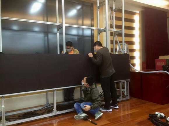 正值新春佳節,全體員工休假,但各部門同事深知疫情不等人,迅速整裝集結,了解庫存狀態、組織工程安裝、設備運輸等,各項工作緊鑼密鼓地展開。針對現場安裝高度不足的問題,工程師們在公司總部對現有的支架進行切割改造,運抵現場后再與先期抵達的顯示單元、處理器等設備進行搭建、調試,突擊隊員們通宵加班,爭分奪秒搶時間。到大年初三上午8 時,通常需要一周才能完成的系統,從設計、備貨、運輸,到安裝、調試,僅36小時就順利建成,比要求完成的時間整整提前了12個小時!