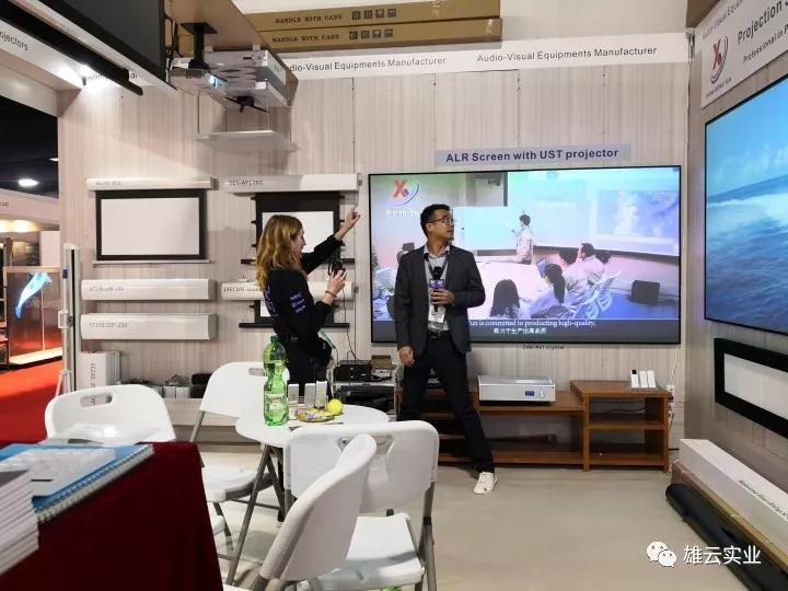 我們的展位呈現了客廳影院系統,家庭影院系統,會議視訊系統等多套系統。眾多高端產品:窄邊黑晶抗光幕、黑柵抗光硬屏、電動幕、豪華電動地升幕、隱藏天花幕等銀幕,還有高端系列吊架和高品質音視頻線材參展,吸引很多國外參展客商的眼球。