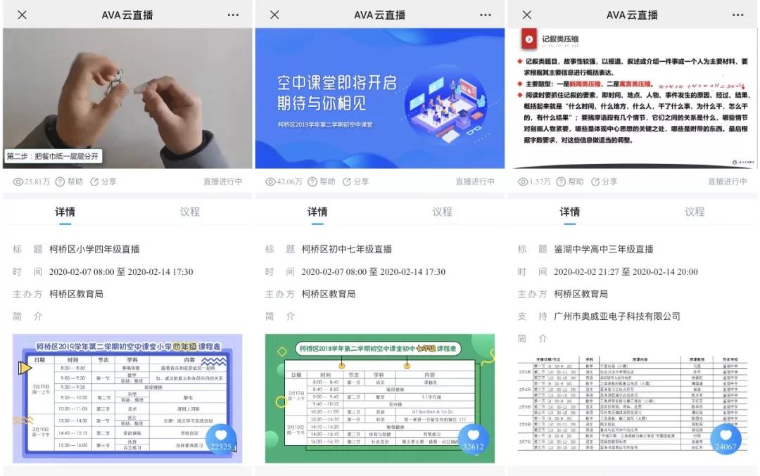 自1月28日起,奧威亞面向全國教育系統推出三大免費服務助力各地“停課不停學”。服務一經推出便迅速獲得浙江省教育系統的關注,主動聯系后奧威亞及時給予響應,目前已為溫州市甌海區、紹興市上虞區以及柯橋區等各區域教育局提供強有力的服務與支持。2月10日,柯橋區首日直播觀看人次就高達700萬+。
