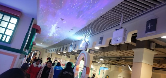 曲線型的天幕宛如銀河星帶,不停變換著夢幻光影,游客紛紛駐足欣賞。恒隆廣場此次引進的是宏碁LU-W300激光超短焦投影儀,可以在54cm的近距離投射出100英寸的大畫面,在場地環境及安裝位置上極具靈活性。在6臺投影機的拼接合作下,形成17米長、2.2米寬的震撼投影,橫跨游樂中心上方,抬頭即可欣賞天幕盛景,為游客帶來身臨其境的觀賞體驗。
