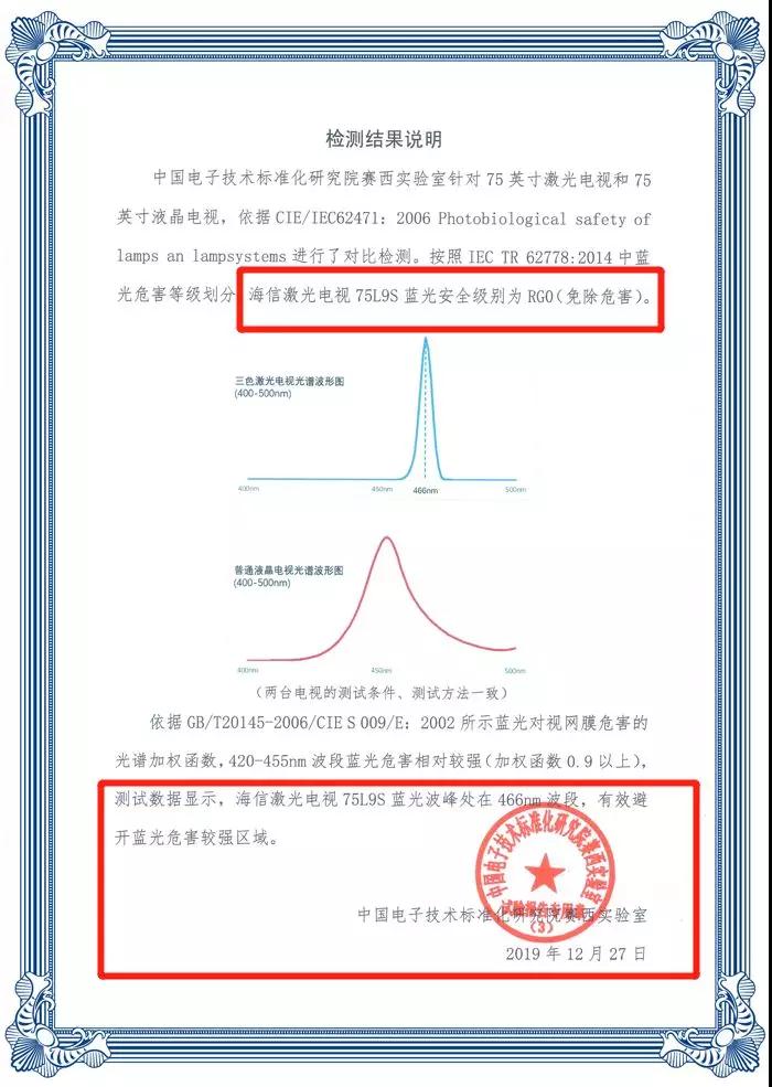 另外,據測試,海信激光電視75L9S藍光波峰處在466nm波段,有效避開藍光危害較強區域,該產品的藍光安全級別為RG0(免除危害)。