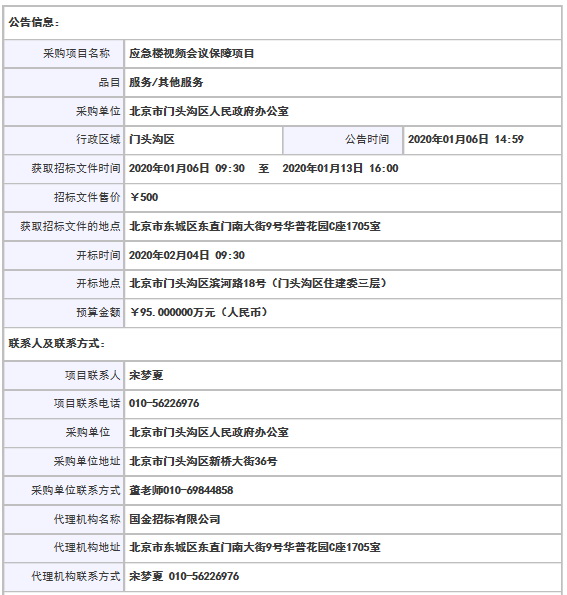 北京市門頭溝區(qū)人民政府辦公室應(yīng)急樓視頻會議保障項目公開招標公告