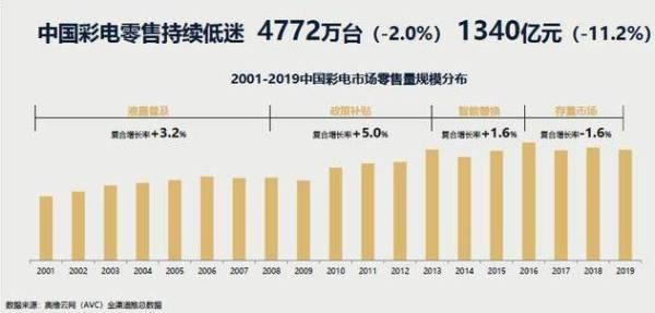 中國電視市場經過十幾年的高速發展后,在近幾年踩住了剎車,進入下滑通道。奧維云網數據顯示,2016年到2019年,中國彩電零售量復合增長率為-1.6%,而2019年更是為-2%。