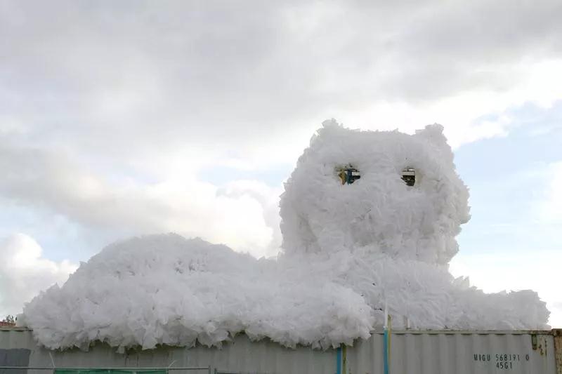 裝置由鋼材組合搭建而成,用九千個白色塑料袋覆蓋。為了在夜晚照亮雕塑,貓的頭部安裝了激光機和無線網絡。