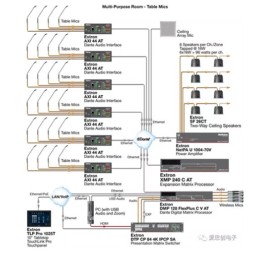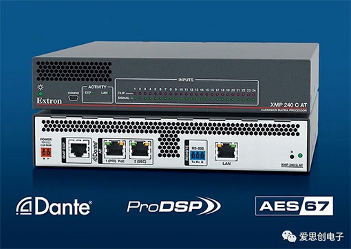 愛思創電子全新推出的 XMP 240 擴展矩陣處理器是一款大規模的混音矩陣,其半機架寬的機身可支持 24 個 AEC 通道及 48x48 的 Dante 連接。該產品也可單獨用于全網絡音頻系統的矩陣處理。當其通過 Dante 網絡或 EXP 擴展端口與 DMP Plus 系列處理器連接時,即可構建一個完整的音頻系統,該系統可提供高達 36 個 AEC 通道,1 個 USB 音頻接口,模擬音頻連接以及可選的 VoIP。通過 XMP 240 擴展的系統可支持具有多路輸出的定向陣列麥克風,以及其它多個 Dante 信號源, 它具有足夠的輸出來支持多區域及地點的設備。XMP 240 可對高通道數量的音頻輸入及輸出進行處理,是基于 Dante 或 AES67 的網絡音頻系統的理想之選。
