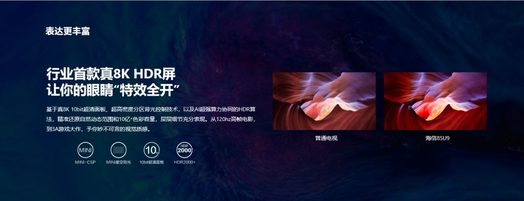 當然,除去在幀數上的優化外,海信電視還特別研發了第三代8K超解像技術,可以實現從低畫質片源到2K、4k、8k畫質的三級優化。配上對抗式AI技術,海信8K Pro雙屏電視U9可實時構建場景模型,對設備沒有拍攝出來的物體細節進行AI場景補償,讓圖像更趨近肉眼可見的真實世界,讓用戶能夠得到更加清晰的觀影體驗。