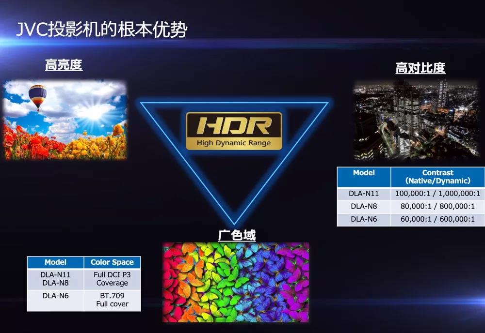 在播放4K HDR 電影時,保持暗場景的深沉黑色、明亮場景的高峰值亮度,而同時又不損失色彩,這對于傳統投影機來說是非常困難的。而JVC通過優秀的高亮度輸出、世界最高的原生對比度、超廣的色域(N11 & N8達到100%DCI-P3色域),完美達到了這些要求,把4K HDR技術的革命性優勢完美呈現給用戶。