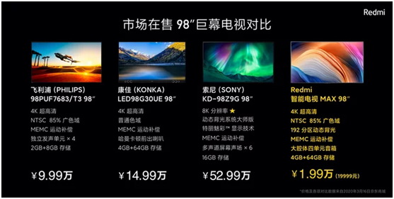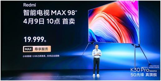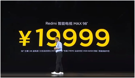 3月24日,小米集團副總裁、中國區總裁、紅米Redmi品牌總經理盧偉冰在北京小米科技園正式發布了Redmi智能電視98寸MAX,售價19999元。