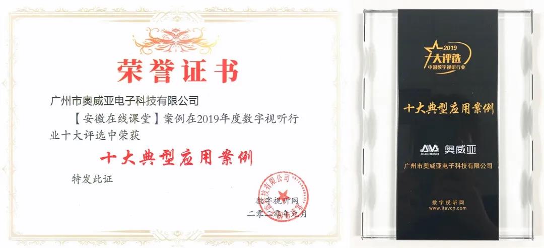 “數字視聽行業年度十大評選活動”是業界具有重大影響力的年度盛宴,截至2020年已成功舉辦十屆,見證了數字視聽等新興行業領域優秀品牌的誕生。在“2019年度數字視聽行業十大品牌評選活動”中奧威亞經過:自主報名、篩選入圍、網上投票、專家評定等多層角逐,最終從眾多競爭對手中脫穎而出,一舉拿下“2019視頻會議-十大卓越品牌”和“2019十大典型應用案例(安徽在線課堂)”雙料大獎!