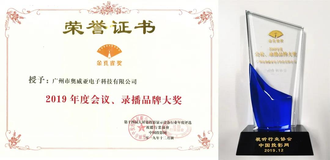 圖為奧威亞榮膺“2019年度會議、錄播品牌大獎”與獎牌