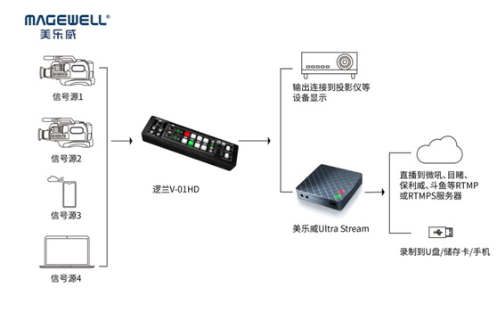 如果你的直播場景中有3-4個視頻源,方案一或是佳選。視頻源通過HDMI線連接至邏蘭V-1HD切換臺,切換臺在對視頻進行特效加持、聲音處理后輸出2路HDMI信號。如果需要本地顯示,你可以連接一個投影儀、顯示器或TV等設備;如果需要進行視頻直播,你可以連接一個支持獨立工作的直播編碼盒。方案一中美樂威Ultra Stream編碼盒在進行直播的同時還支持視頻的錄制備份,支持直播地址和錄制方式的預設。因此,在進行活動導播時,你可以將注意力更多的放在攝像機的拍攝角度調整和視頻切換上面。